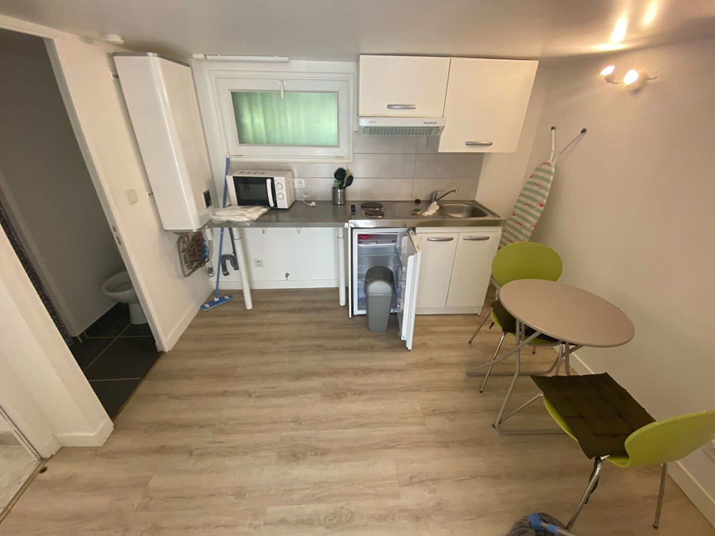 ORSAY. 'Quartier Mondétour'. Proche des commerces et des bus, cet appartement de type F1 meublé d'une superficie de 20,42 m² Loi Boutin situé au rez-de-jardin, comprend : une entrée, un séjour (mobilier : lit, table de chevet et armoire), un coin cuisine équipée (plaques, hotte, évier, réfrigérateur, table et chaises) et une salle d'eau avec wc.